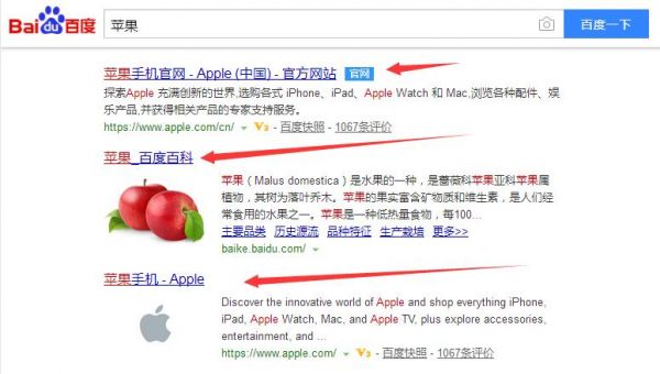 关于这个问题,笔者查阅了一些资料,仍然不能完全明了。举个例子,打开百度,搜索“苹果”,搜索结果如图: