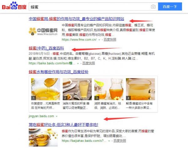 笔者认为,在做SEO的时候,从搜索结果来判断网站的整体优化方向,判断准了,可以大大提高优化效率。再举一个例子,搜索:“蜂蜜”,如图: